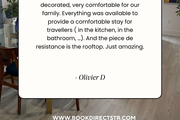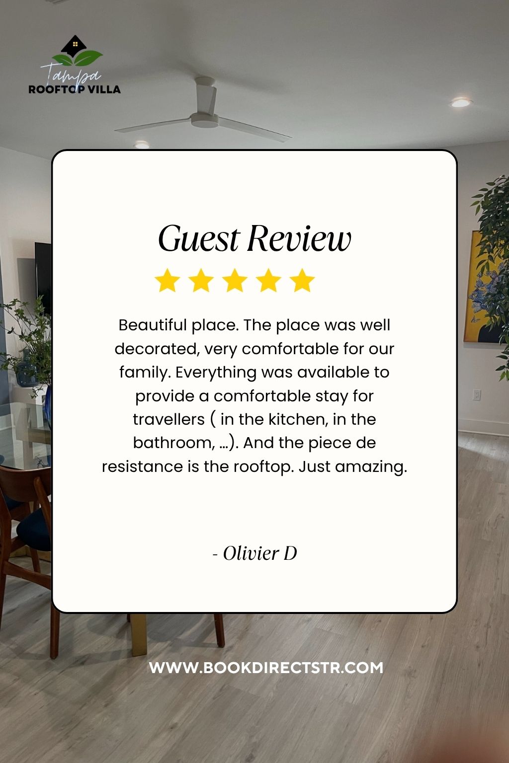 3 Bedrooms • 3 Bathrooms (2 full, 1 half) 3 Baths (2 full, 1 half) • Sleeps 6-8Experience one of Tampa’s most unique luxury stays in this newly built 3-level modern home, featuring an impressive 1,100 sq ft private rooftop with panoramic city views. Located just 6 minutes from downtown Tampa, this spacious property offers the perfect blend of comfort, style, and upscale amenities for travelers seeking something truly special.